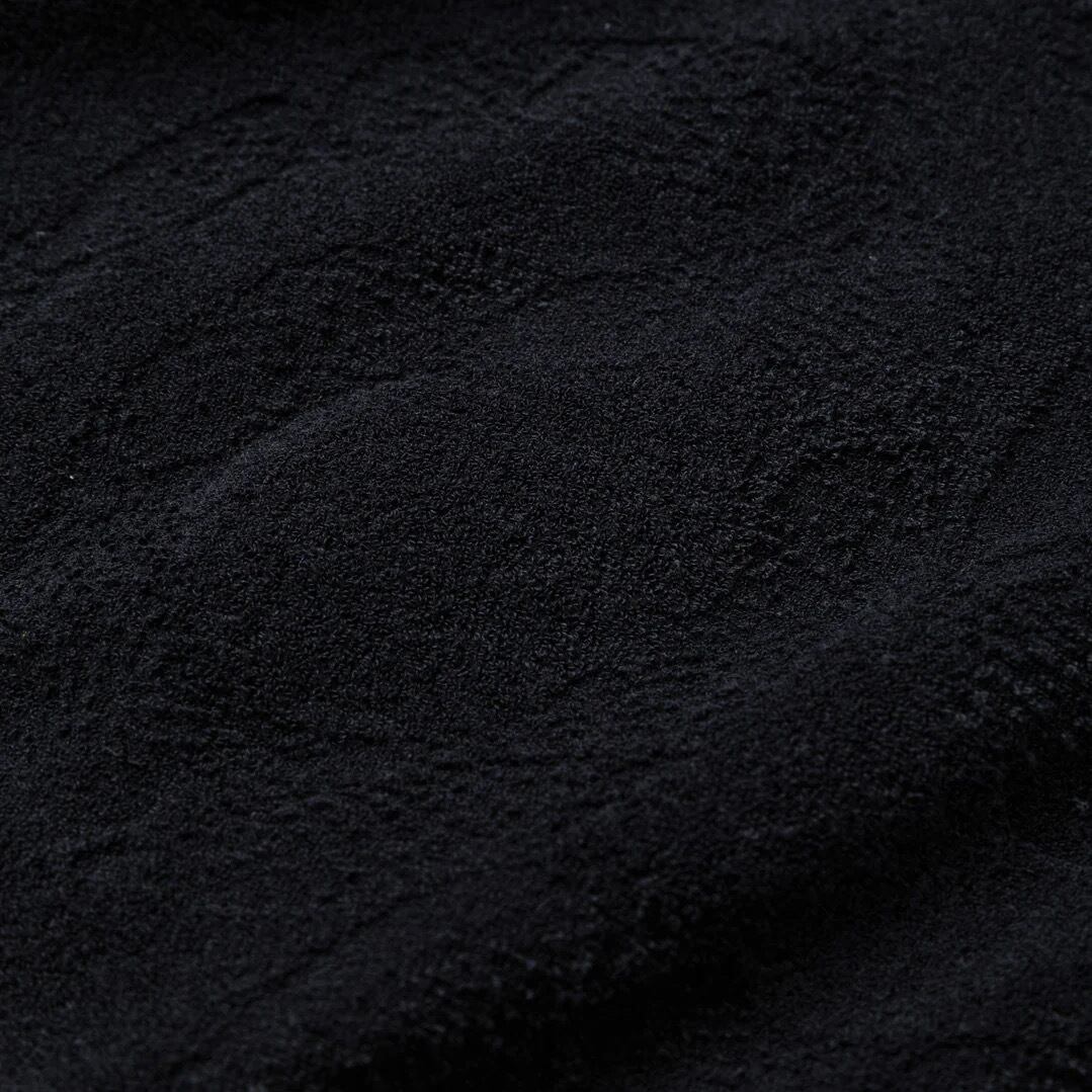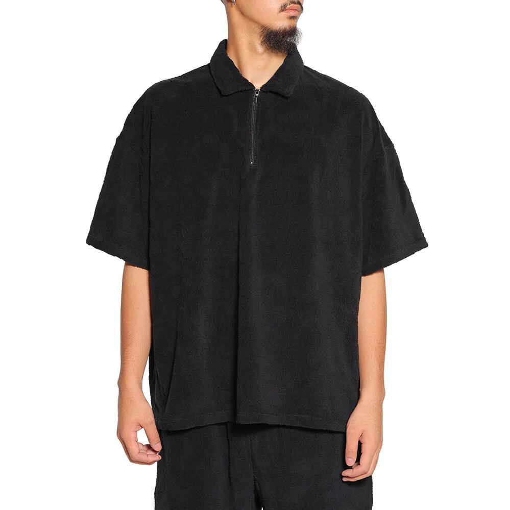 ジャガードスネーク総柄パイルZIPポロ。ジャガード織りにてスネーク柄を肉厚なパイル生地で製作。生地の工程全て国内工場で行っている。ドロップショルダーワイドシルエット。
