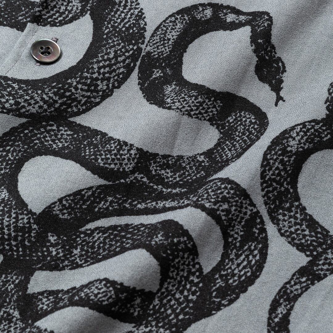 スネークパターン5分袖シャツ。定番のコアポリ生地を採用。身頃、背面、袖それぞれのパーツにスネークパターンプリントを配置。生地にオリジナルスネークパターンを余白が残る様にプリントし、裁断、縫製を行っている。ショート丈のドロップショルダーワイドシルエット。