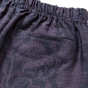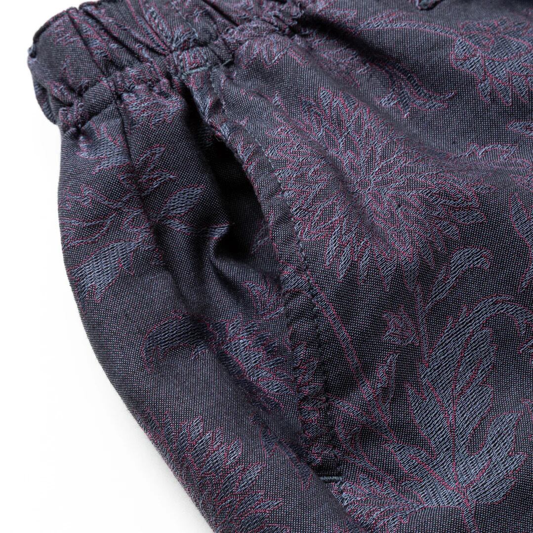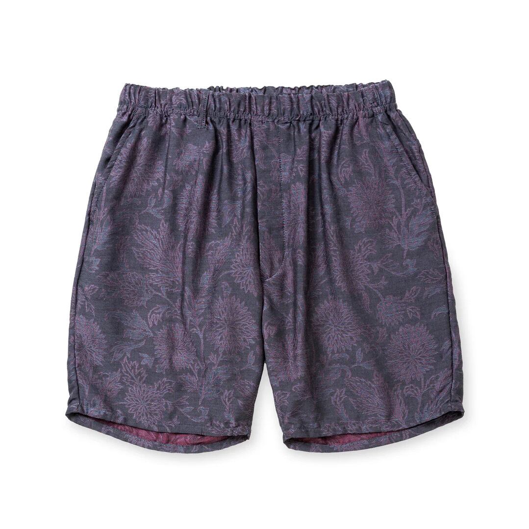 ジャガード総柄ショーツ。オリジナル更紗模様先染めジャガード。経糸に綿糸 緯糸にポリエステルブライト糸(光沢糸)を使用する事で、深みのある色、柄を表現。ウエストゴム、紐仕様。