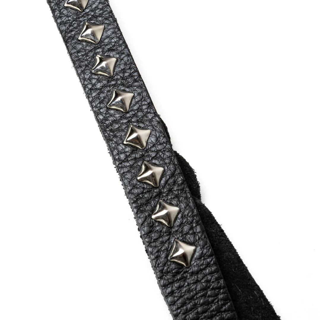スタッズレザーと編み込みレザーで作製されたショートタイプキーリング。チャームレザーにピラミッドスタッズを配した。裏側にもブランドネームの刻印が入る。BLACK / BLACK はスタッズ、ナスカンに黒メッキ加工を施した。