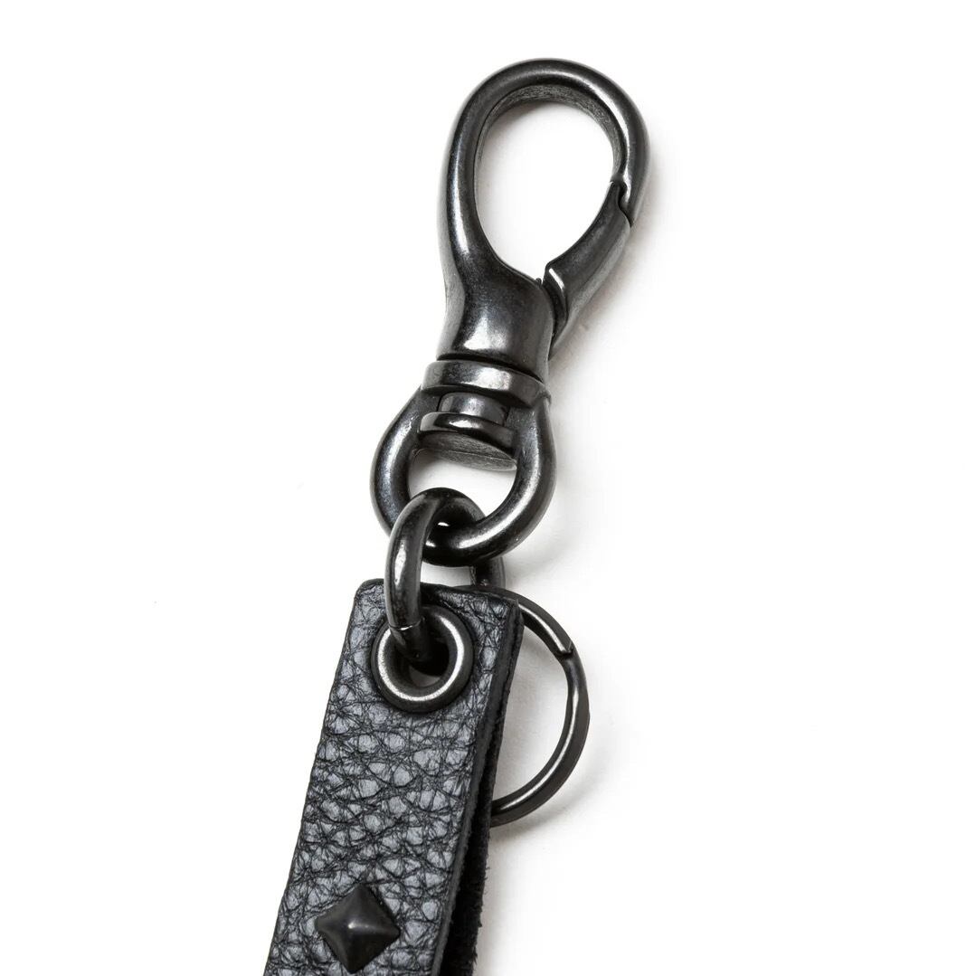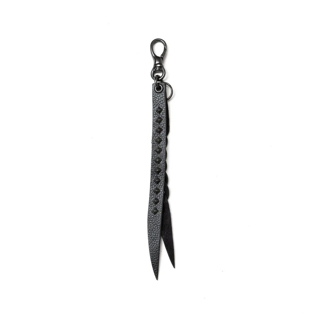 スタッズレザーと編み込みレザーで作製されたショートタイプキーリング。チャームレザーにピラミッドスタッズを配した。裏側にもブランドネームの刻印が入る。BLACK / BLACK はスタッズ、ナスカンに黒メッキ加工を施した。