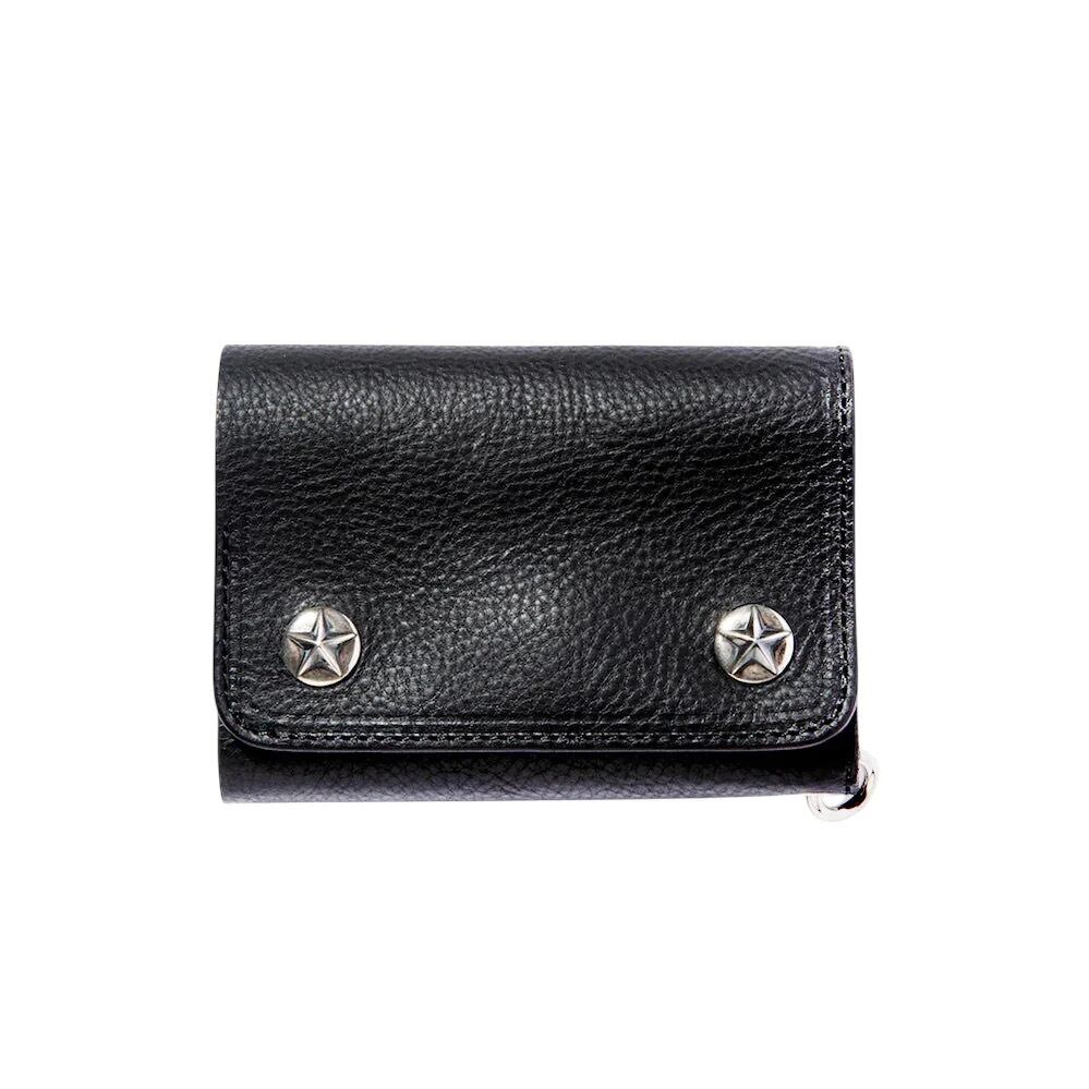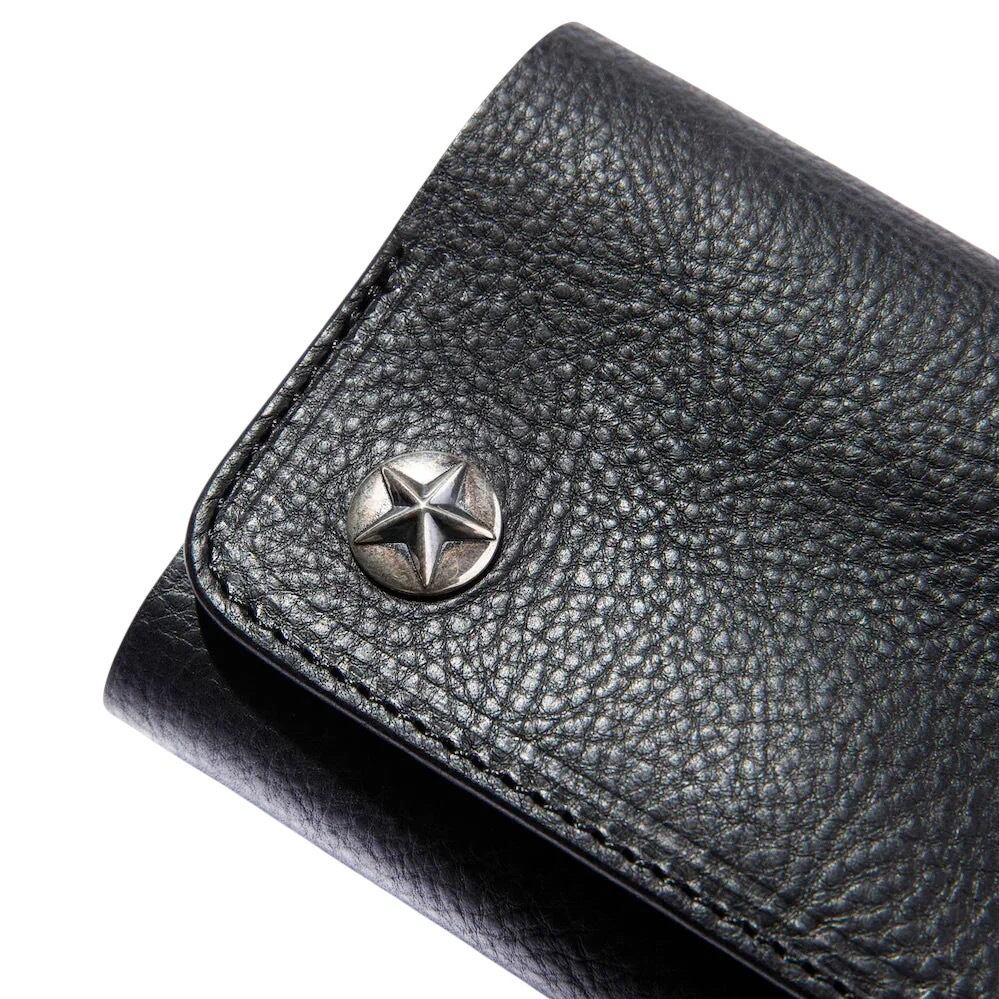 シルバーのスターコンチョボタンを使用し、作製された三つ折りタイプのハーフウォレット。レザーにはシボ感あるレザーを採用。使い込む程にシボが消え、艶感ある経年変化を楽しむ事が出来る。また、収納もしっかりと確保し、使い勝手の良いウォレットに仕上がっている。