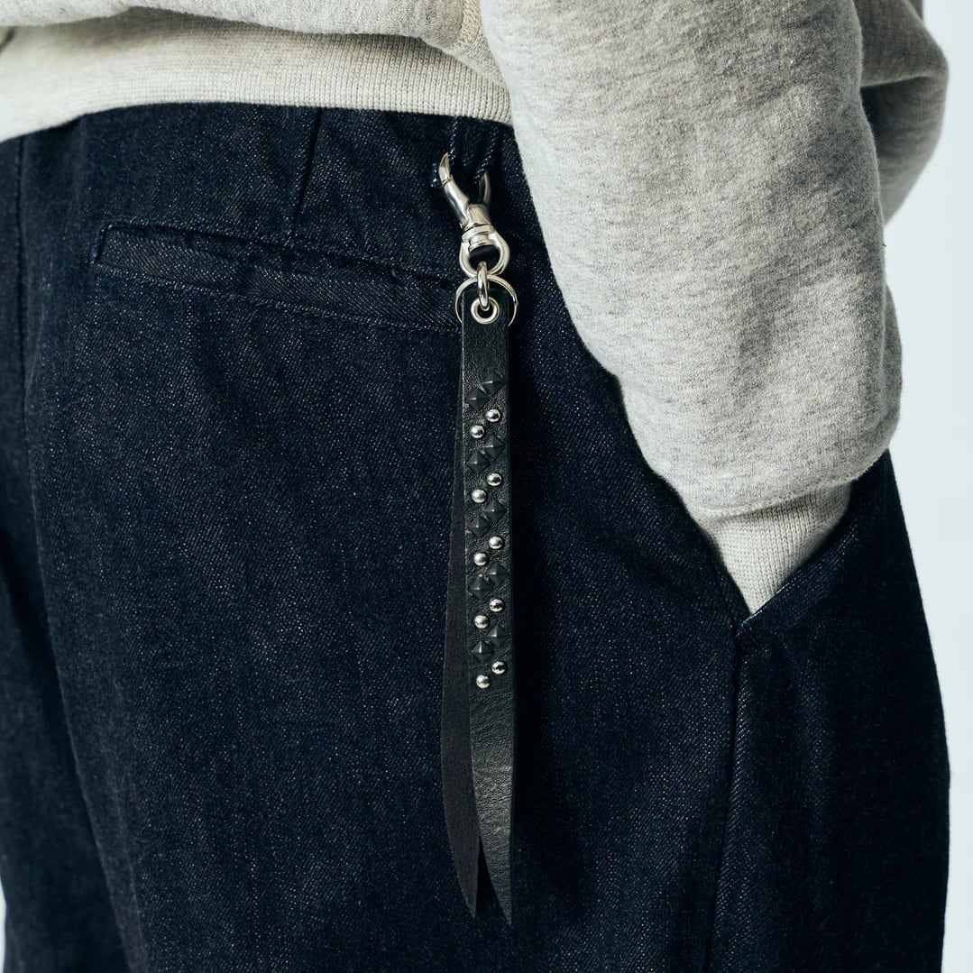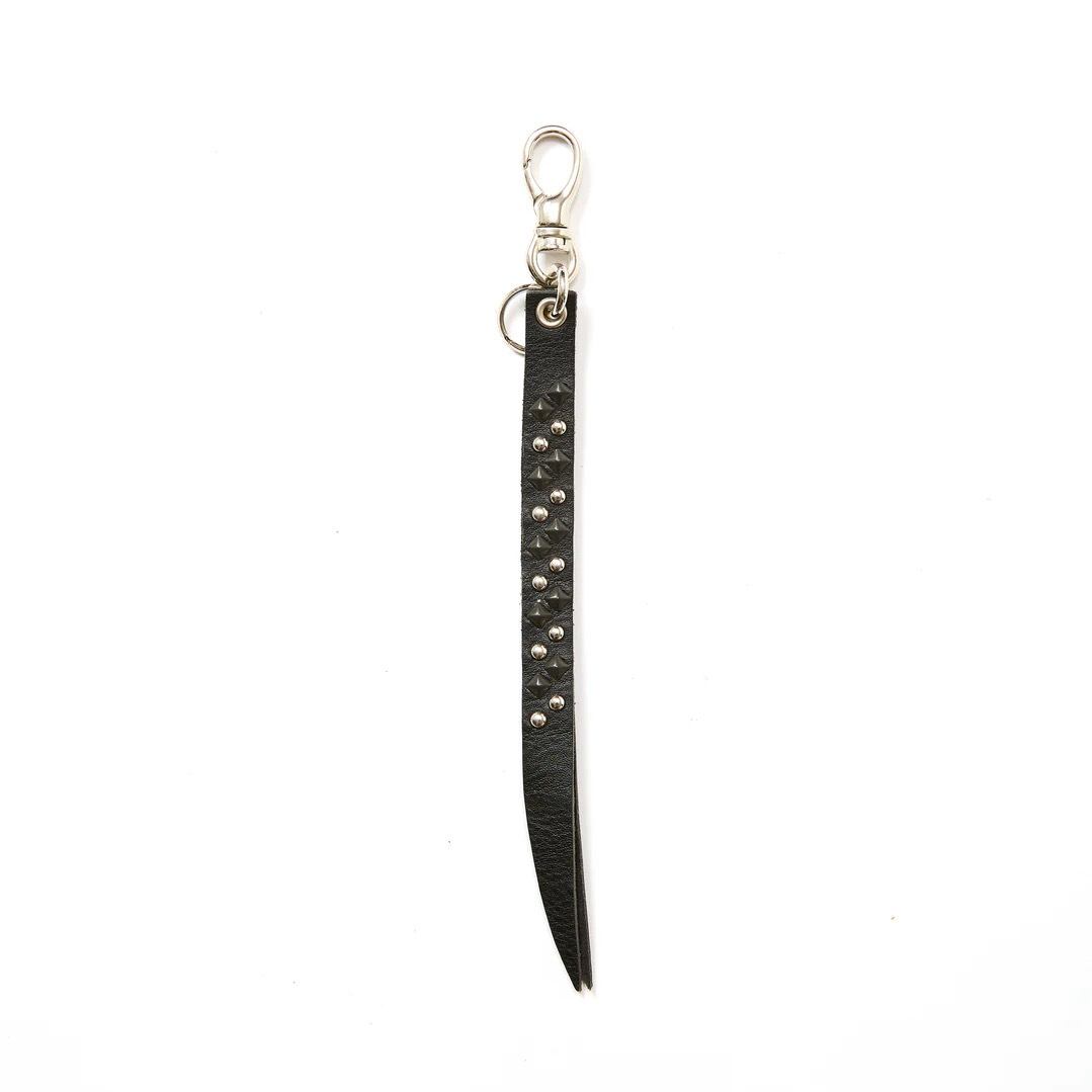 スタッズレザーで作製されたショートタイプキーリング。ラウンド型とピラミッド型ブラックスタッズを配した。裏側にもブランドネームの刻印が入る。