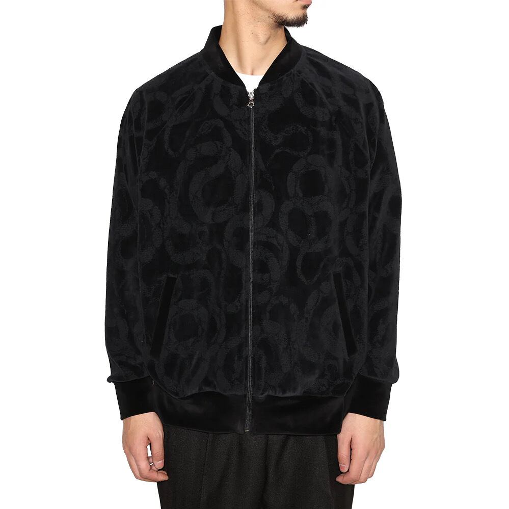 ジャガード総柄ベロアリブジャケット。定番のスネーク柄をジャガード織りにて表現した肉厚なベロア生地を採用。生地の工程全て国内工場で行っている。襟、袖口、裾、ポケット口は無地ベロアで切り替え。