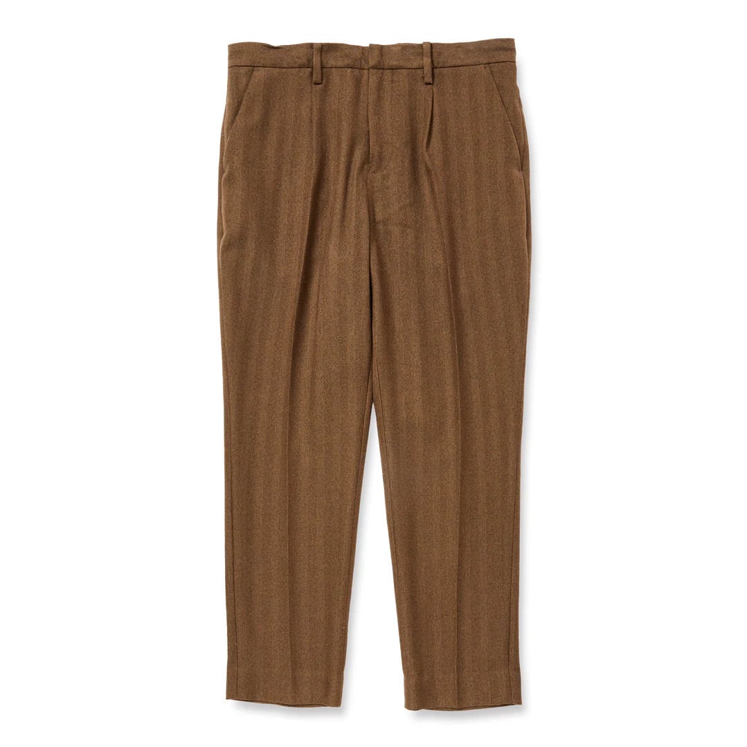 ヘリンボーンスラックス。ヘリンボーン柄のポリエステル製ウールライクファブリックを採用。イージーケア性に優れ、ピリングもしにくく、ウール素材の雰囲気を出しながらも、デメリットを解消したユーティリティー素材。ヴィンテージディテールを採用したテーパードシルエット。