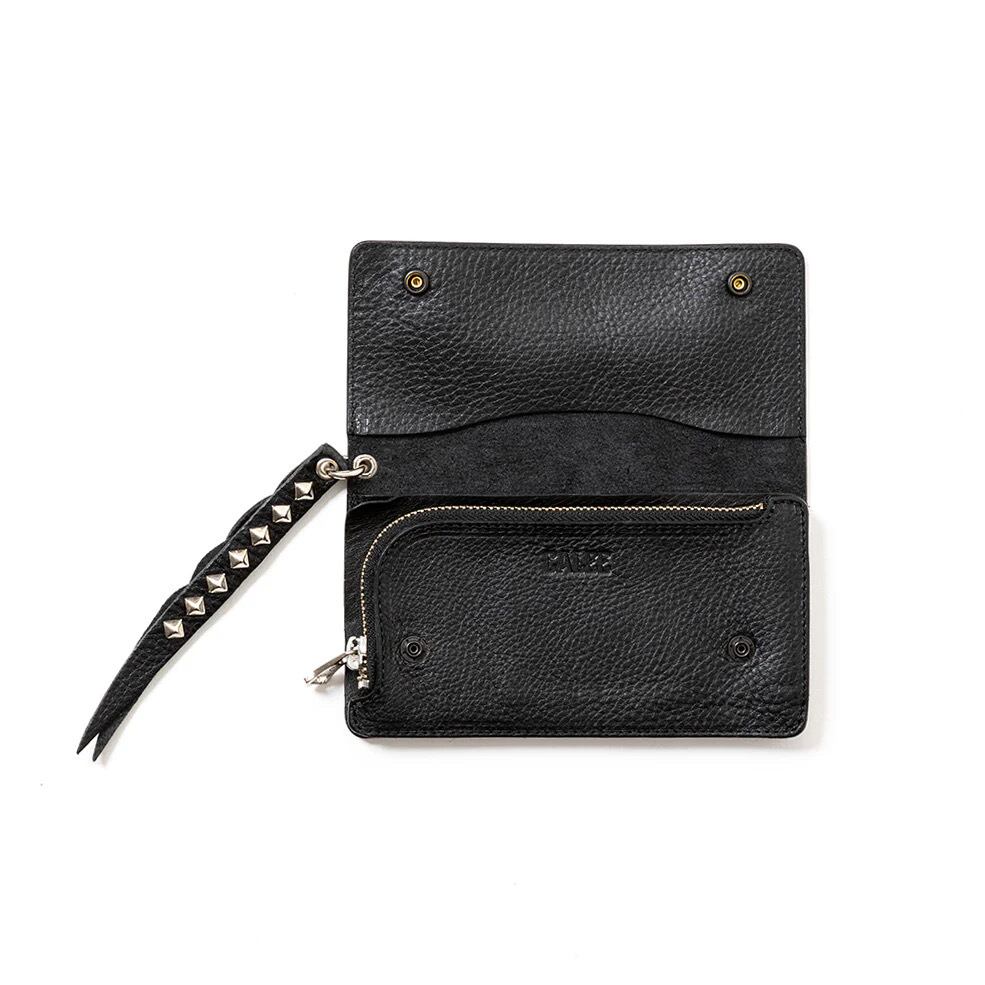 シボ感あるプレーンレザーにスタッズチャームを施して作製されたロングウォレット。レザーは使い込む程にシボが消え、艶感ある経年変化を楽しむ事が出来る。また、収納もしっかりと確保し、使い勝手の良いウォレットに仕上がっている。
