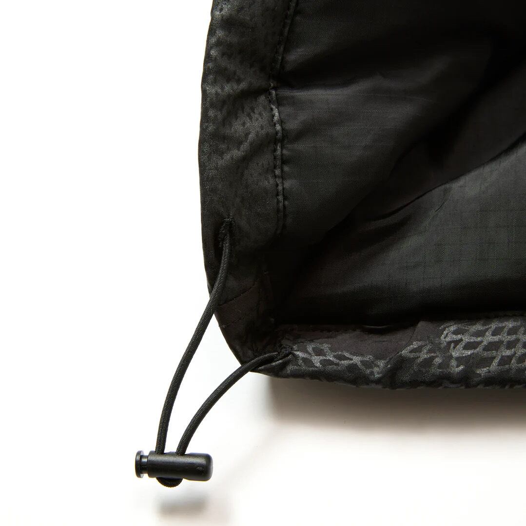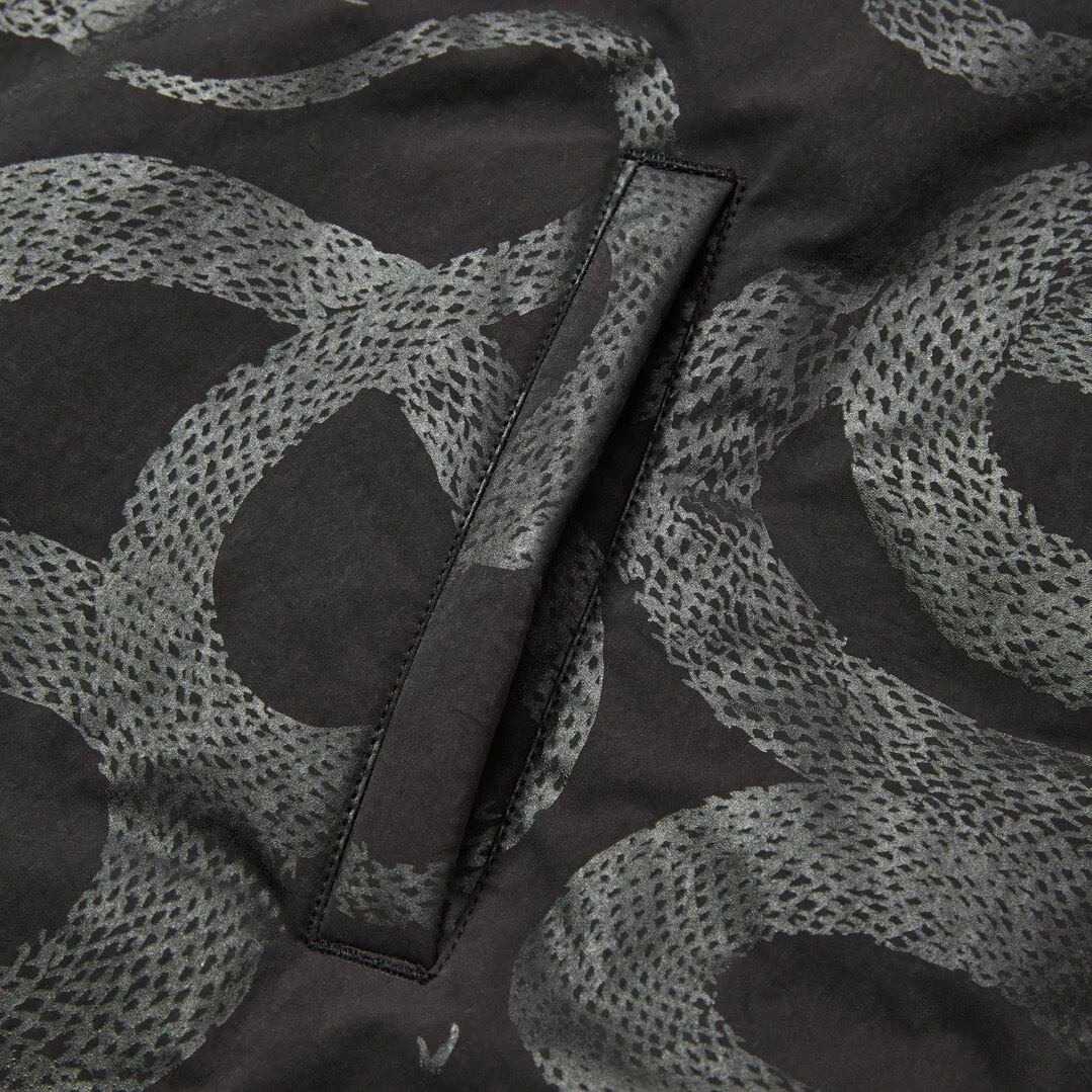 トラックジャケット。スネーク柄をプリントしたライトミリクロスを採用。ポリエステル/ナイロンツイルを特殊加工で極限まで密度を高めて製作した生地に、横浜手㮈染にてウレタン樹脂に黒顔料を混ぜプリント。裏地は高機能中綿入りWリップストップナイロン。引き手に蛇革を使用、裾ドローコード付き。