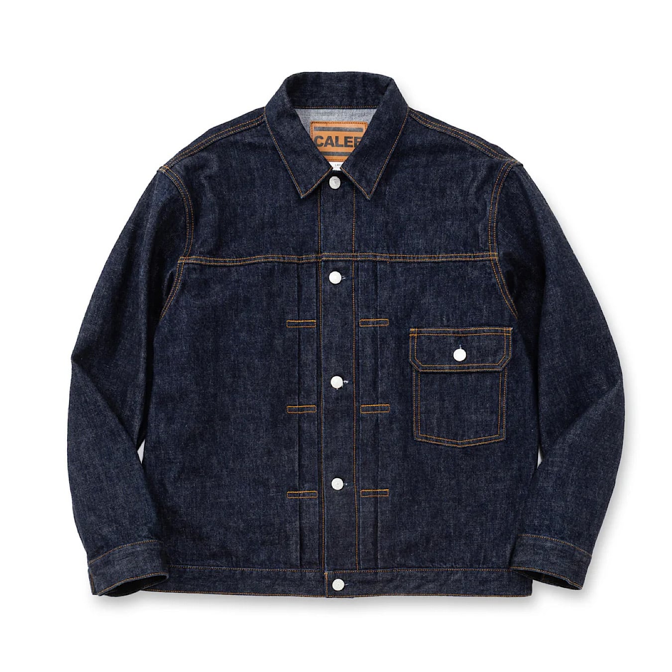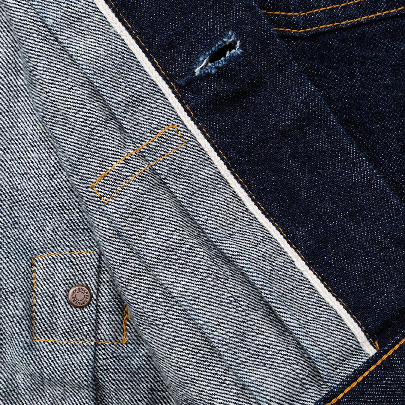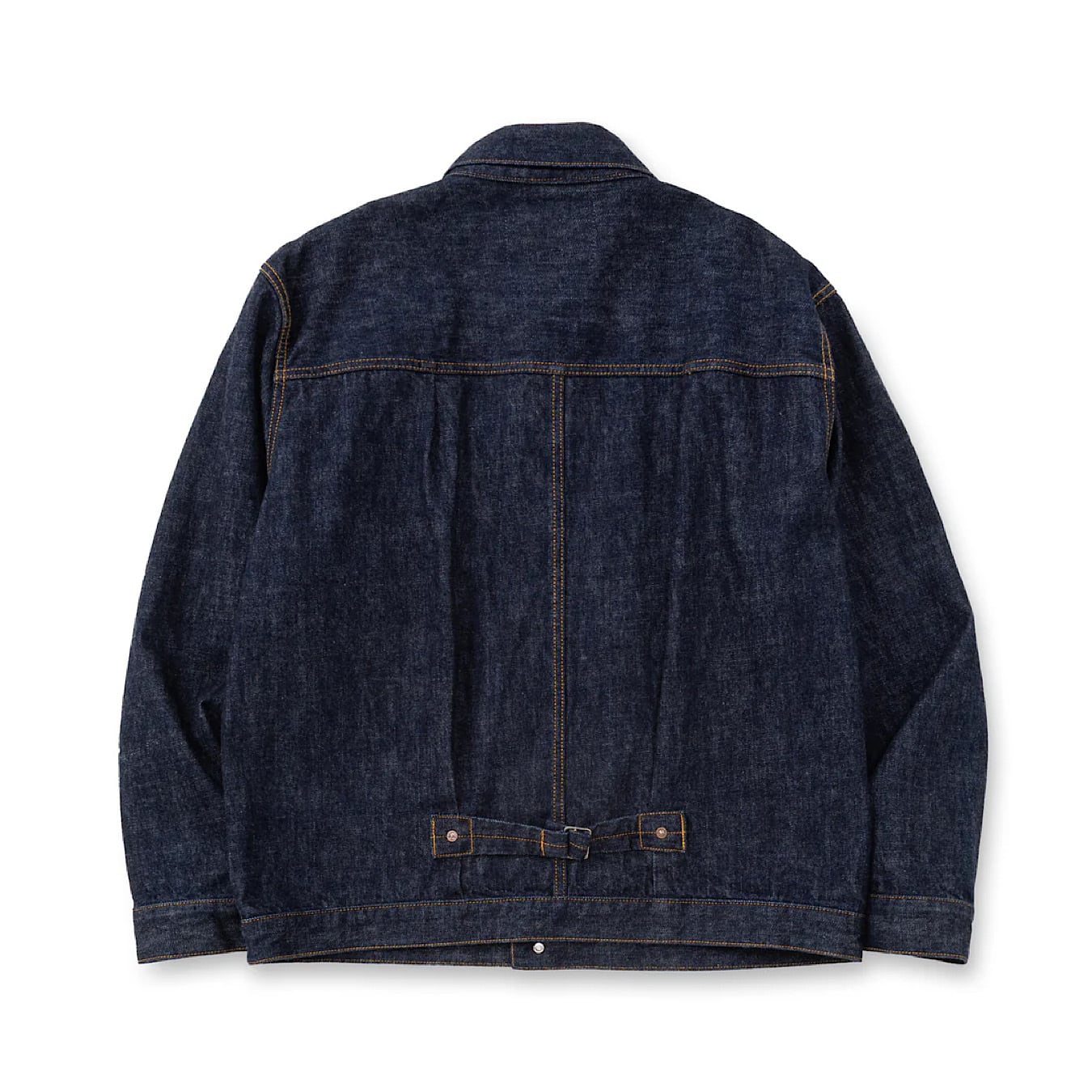 1stタイプデニムジャケット。単一米綿を使用した、ピュアインディゴの14ozヴィンテージリプロデニム生地を採用。毛焼きなしのサンフォライズ加工仕上げで、表面に生機の様な毛羽感があるのが特徴で、米綿特有のムラ感と、ドライタッチでガサついた粗野な風合い。Tバックディテール。ワンウォッシュ仕上げ。