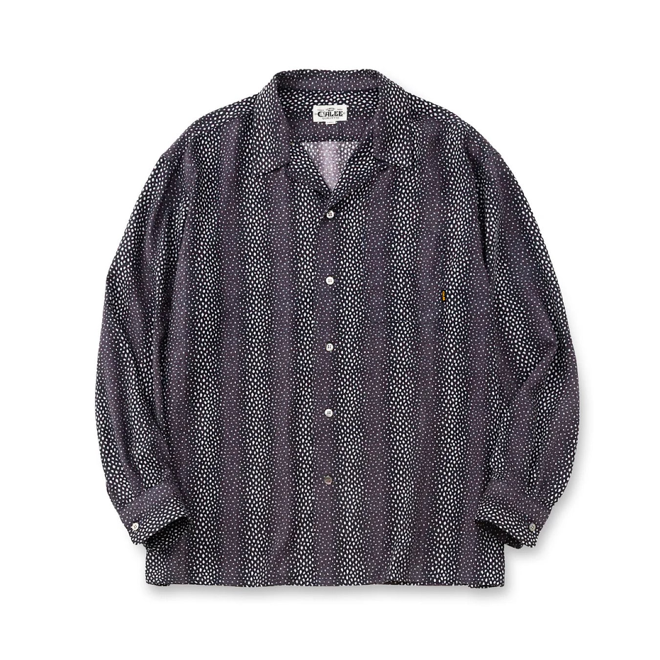 ストライプ柄オープンカラーL/Sシャツ。ポリエステルの芯にレーヨンを巻き付けたコアヤーン糸を作り、アムンゼン組織にて製織した生地を採用。表面はレーヨンでもポリ芯に撚ることでシワになりにくいのが特徴。