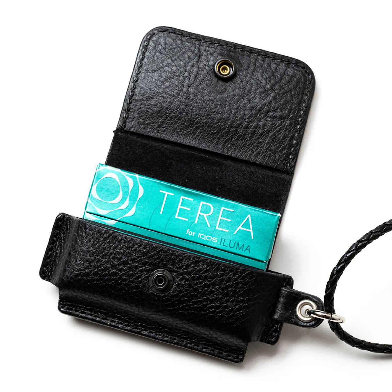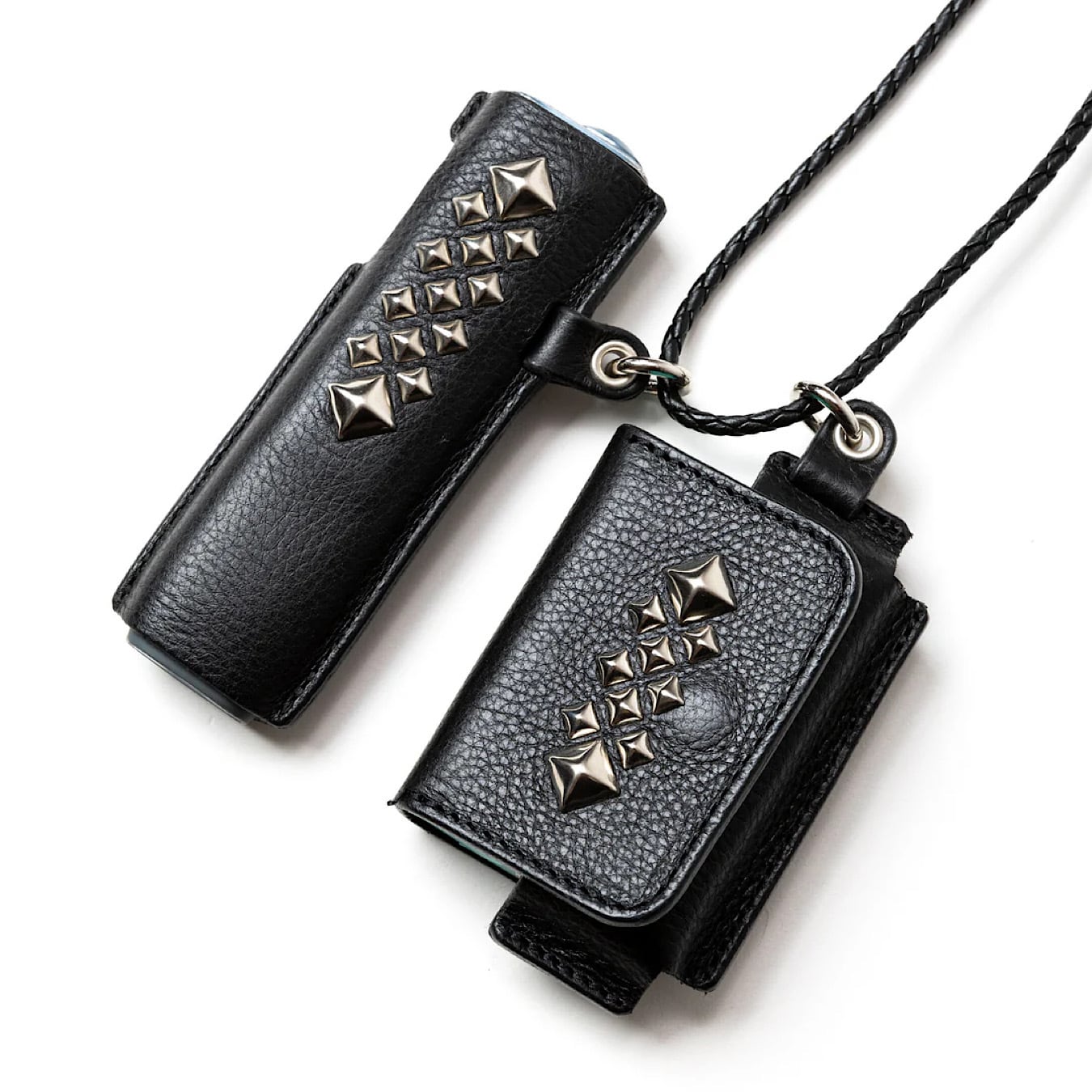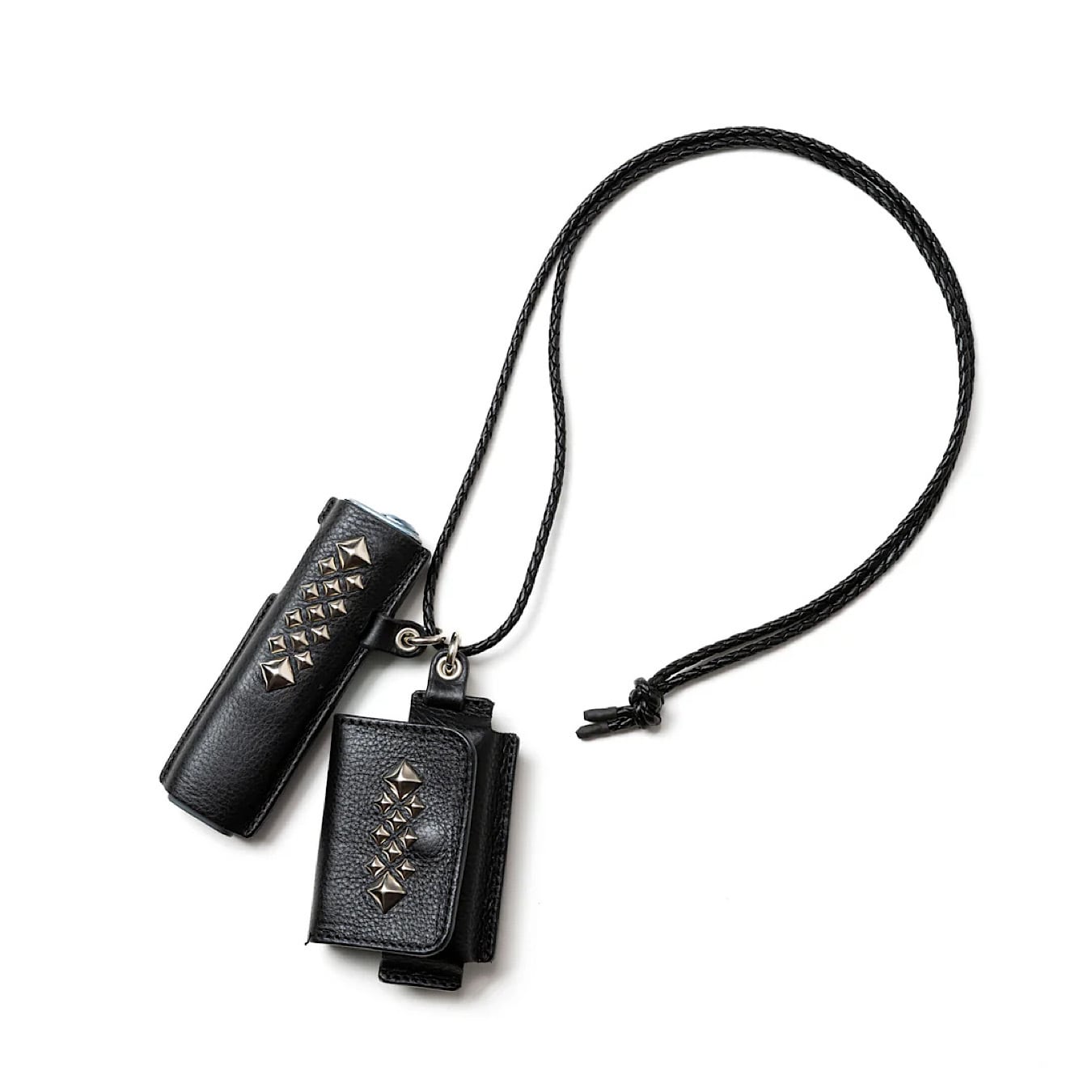 スタッズレザー作製された『iQOS イルマ ワン』ケース& ヒートスティックケース。イタリア、トスカーナ地方にて、 職人の手により1枚1枚丁寧に手鞣し、手染めされたイタリアを代表する最高級ハンドメイドレザー、アリゾナレザーを採用。革本来のナチュラルな風合いとシボが特徴。正面にピラミッドスタッズを配し、裏側にはブランドネームの刻印が入る。レザーネックストラップ付き。