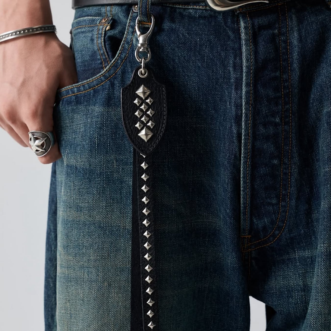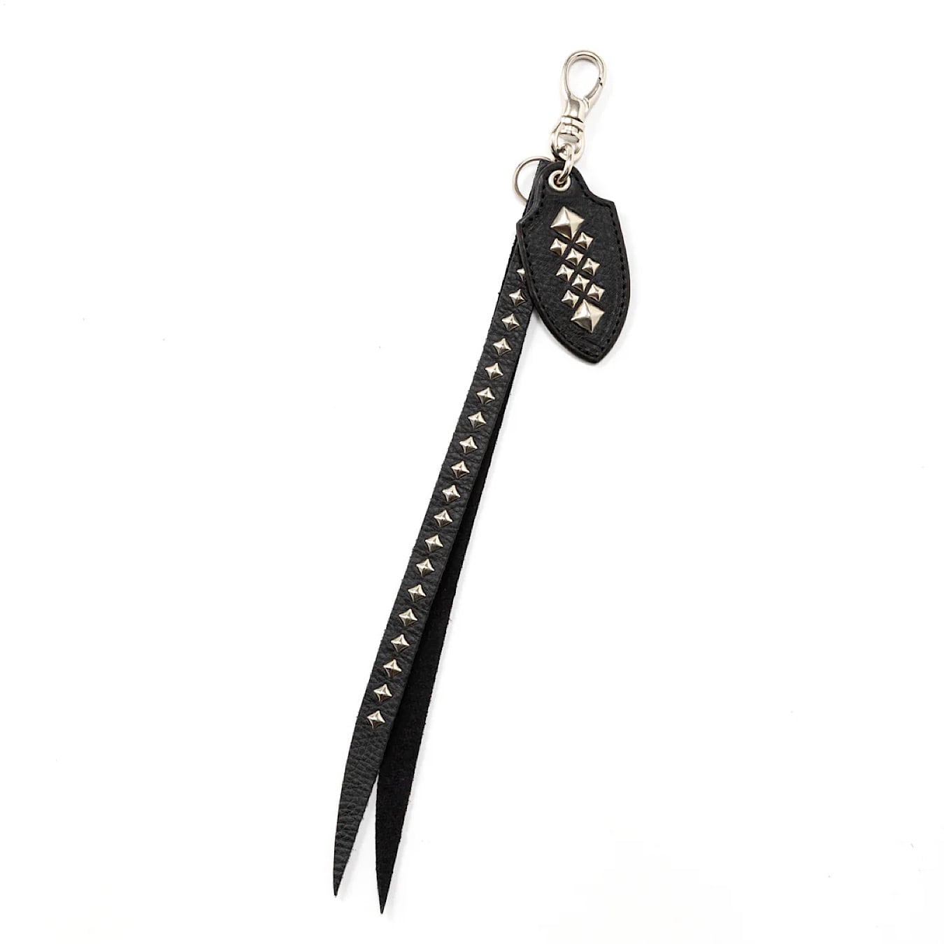 レザーキーリング。イタリア、トスカーナ地方にて、 職人の手により1枚1枚丁寧に手鞣し、手染めされたイタリアを代表する最高級ハンドメイドレザー、アリゾナレザーを採用。革本来のナチュラルな風合いとシボが特徴。ピラミッド型スタッズを施した。