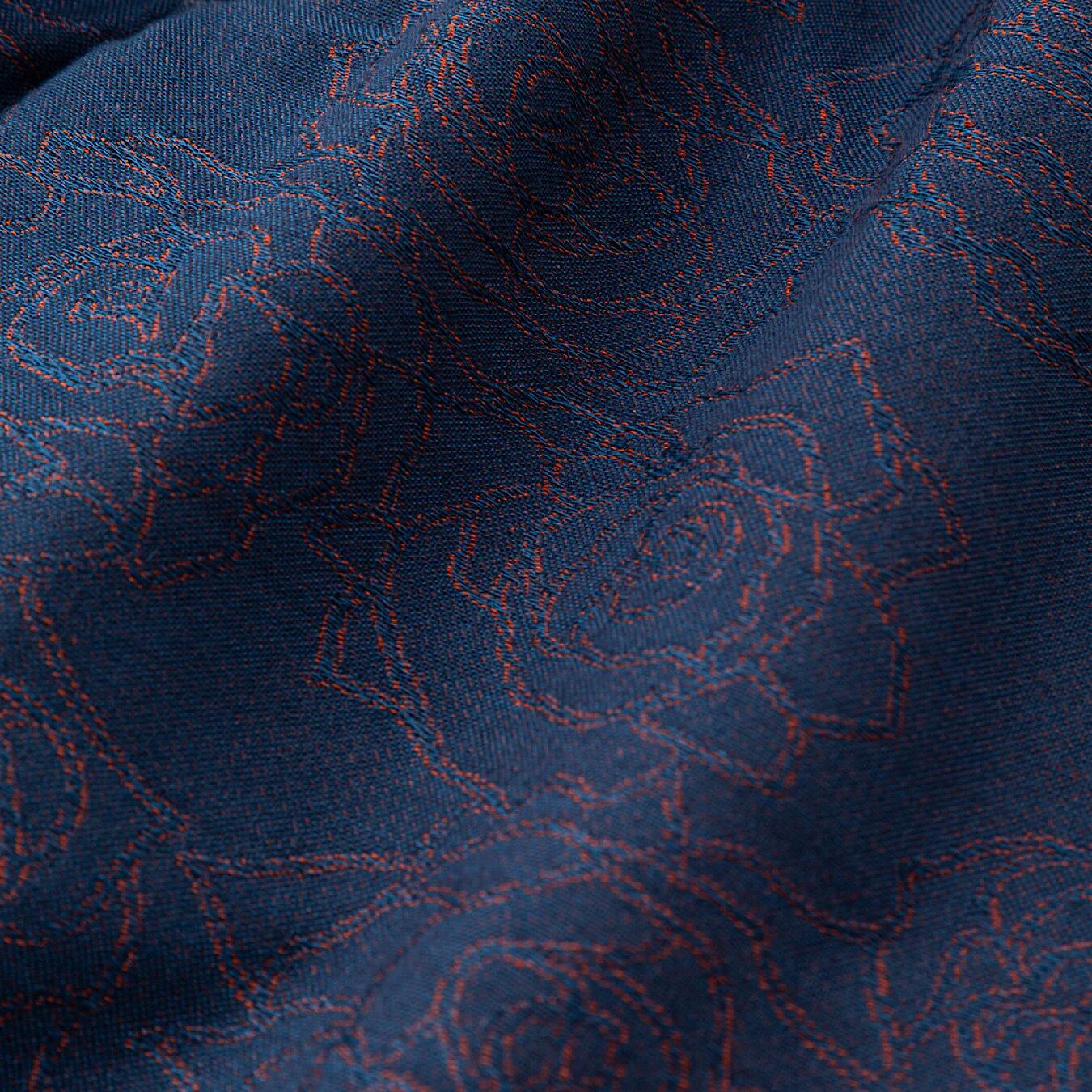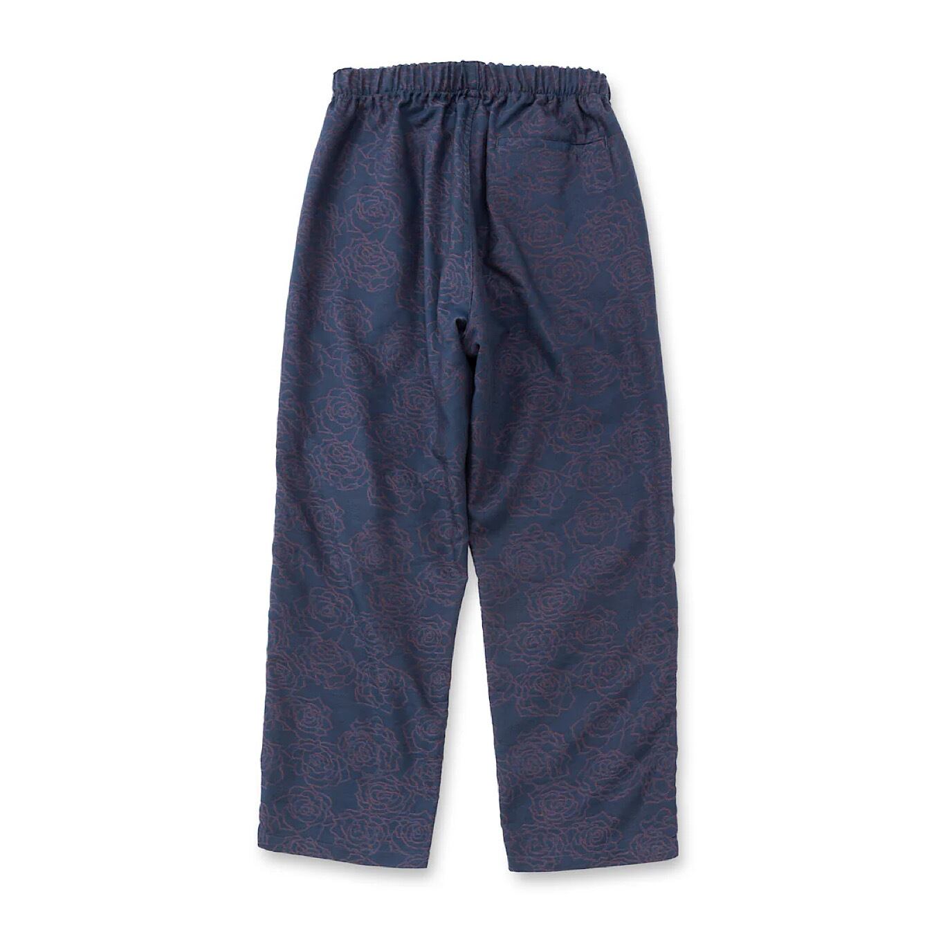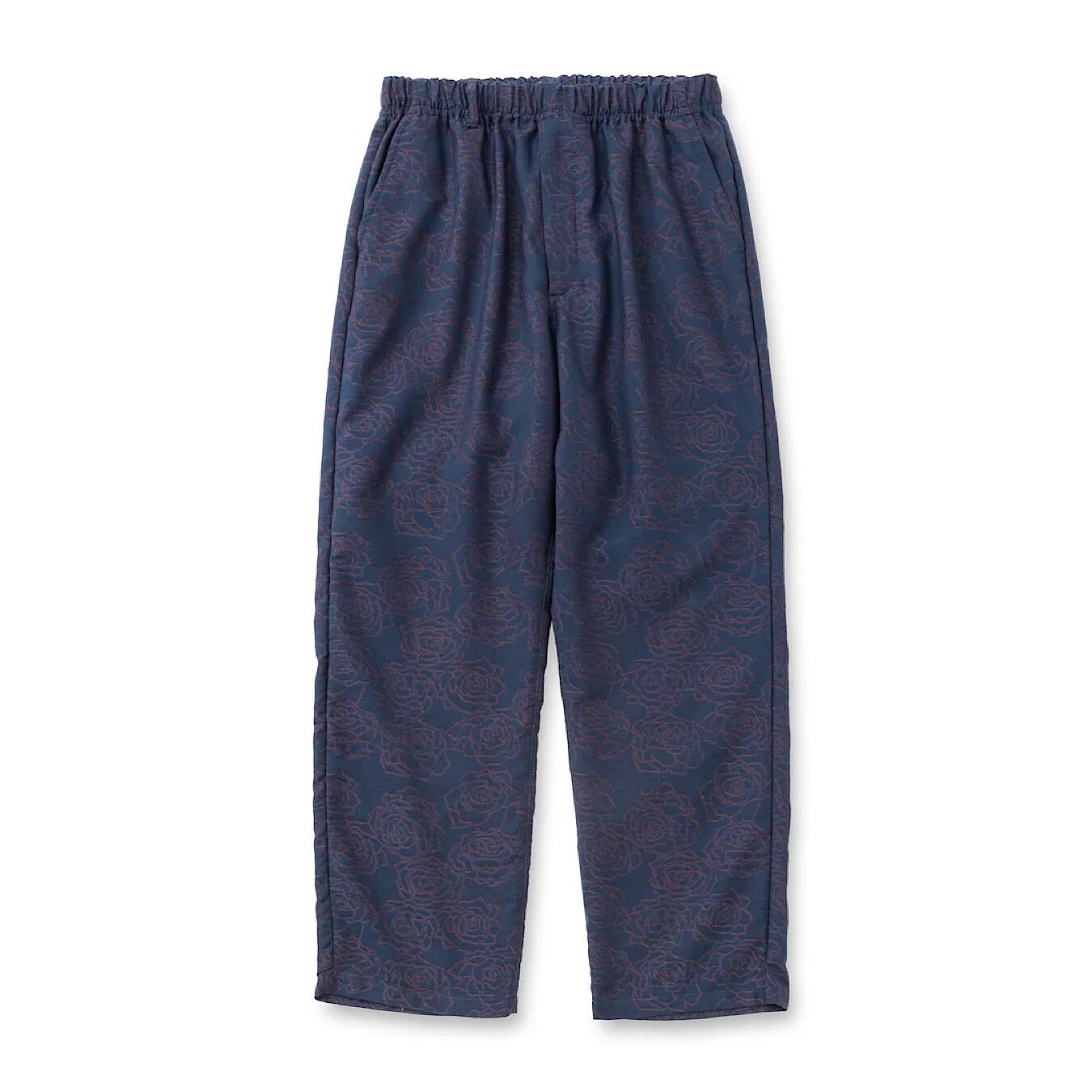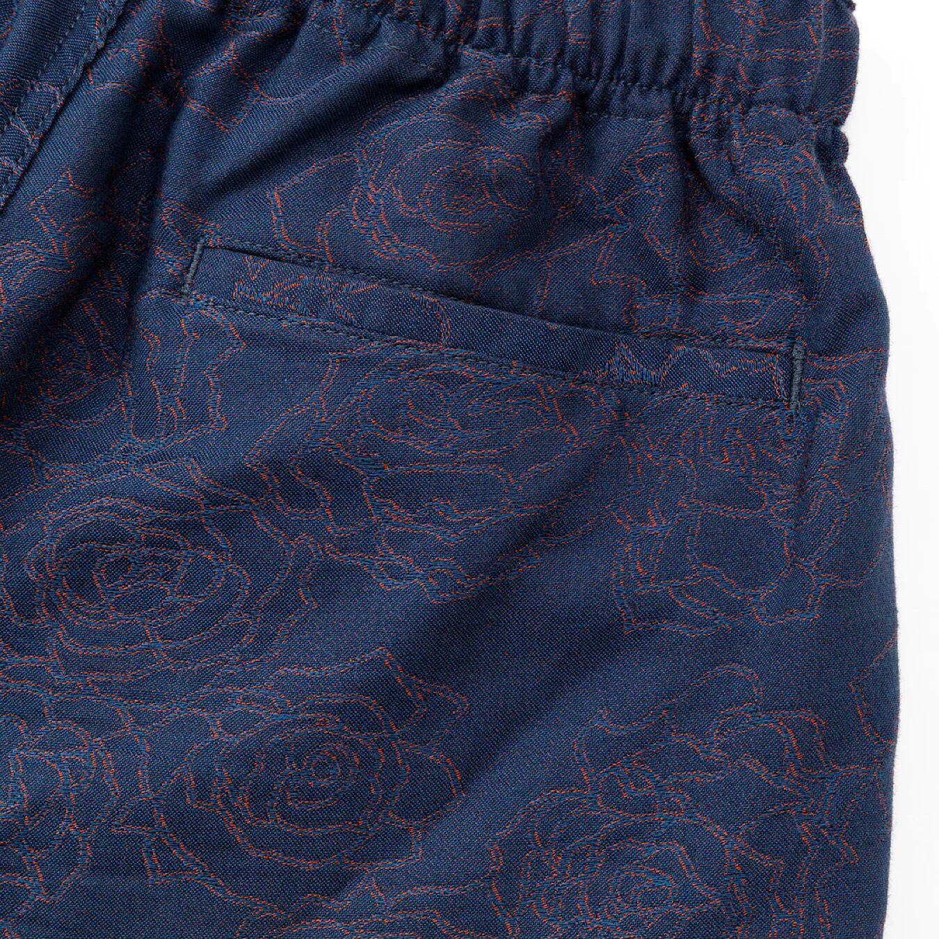 ジャガード薔薇柄イージーパンツ。オリジナル薔薇柄先染めジャガード。経糸に綿糸 緯糸にポリエステルブライト糸(光沢糸)を使用する事で、深みのある色、柄を表現。ウエストゴム、紐仕様。