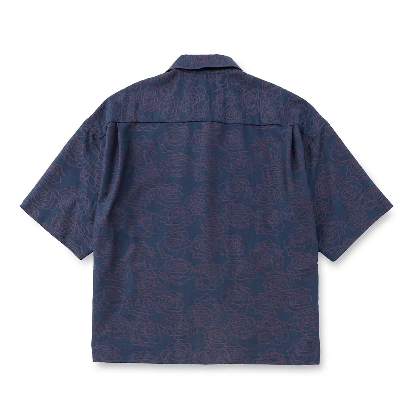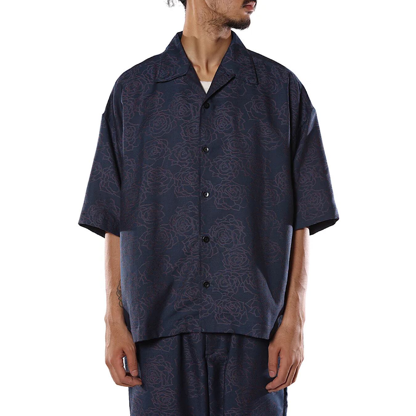 ジャガード薔薇柄オープンカラー5分袖シャツ。オリジナル更紗模様先染めジャガード。経糸に綿糸 緯糸にポリエステルブライト糸(光沢糸)を使用する事で、深みのある色、柄を表現。バックにタックが入るヴィンテージ仕様。