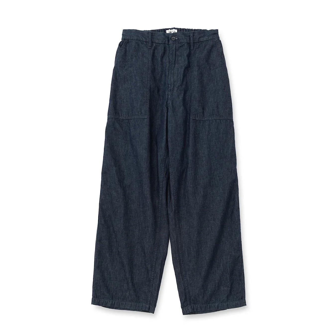 ライトデニムベイカーパンツ。染色から加工までの工程を全て備後産地で行っている、6ozライトデニムを採用。21綾にする事で薄地ながら、適度な張りと強度があるのが特徴。芯まで染まり切らないロープ染色なので、経年変化も楽しめる。ベルトループ付きのウエストゴム、紐仕様。ワンウォッシュ仕上げ。