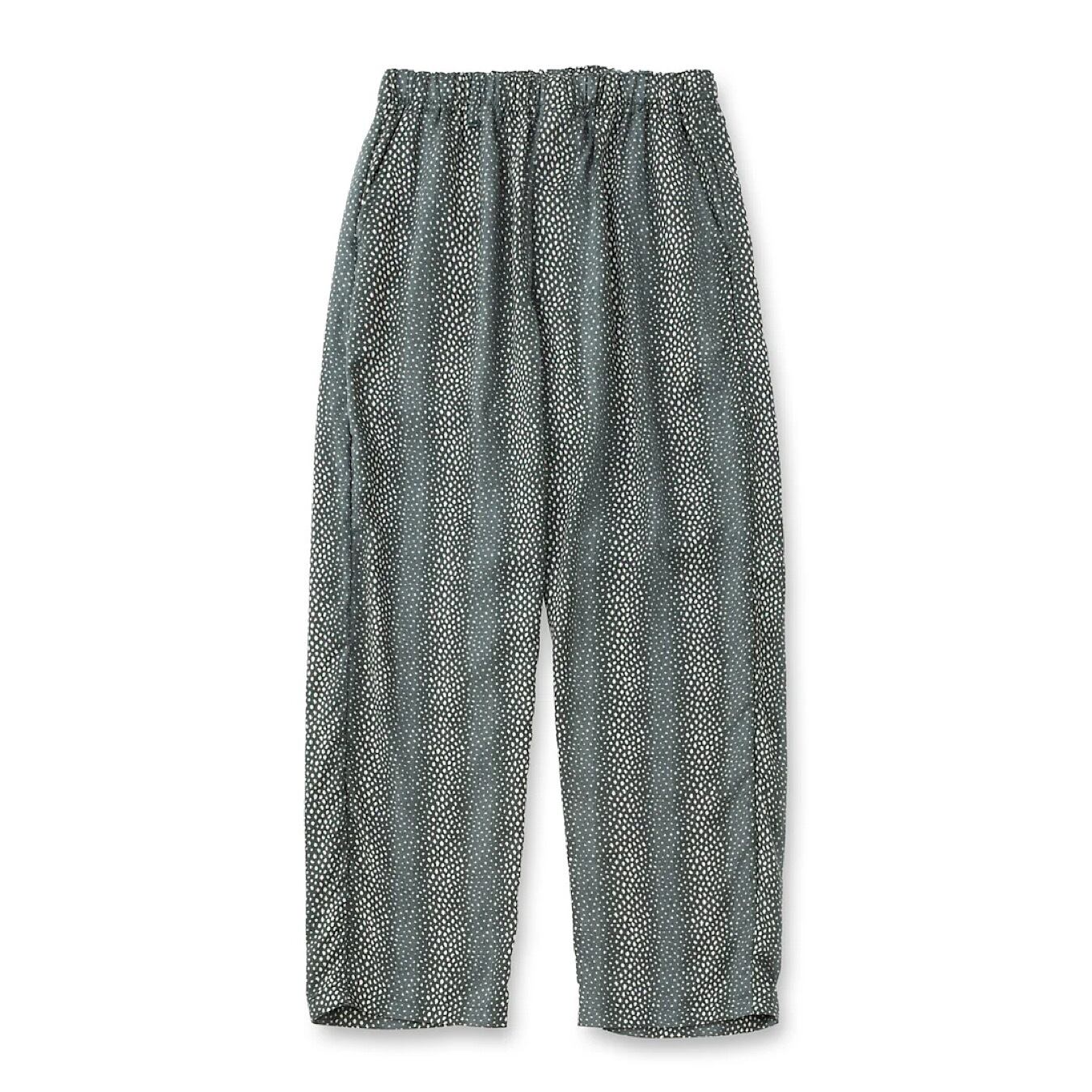 ストライプ柄レーヨンパンツ。ポリエステルの芯にレーヨンを巻き付けたコアヤーン糸を作り、アムンゼン組織にて製織した生地を採用。表面はレーヨンでもポリ芯に撚ることでシワになりにくいのが特徴。ウエストゴム、紐仕様。