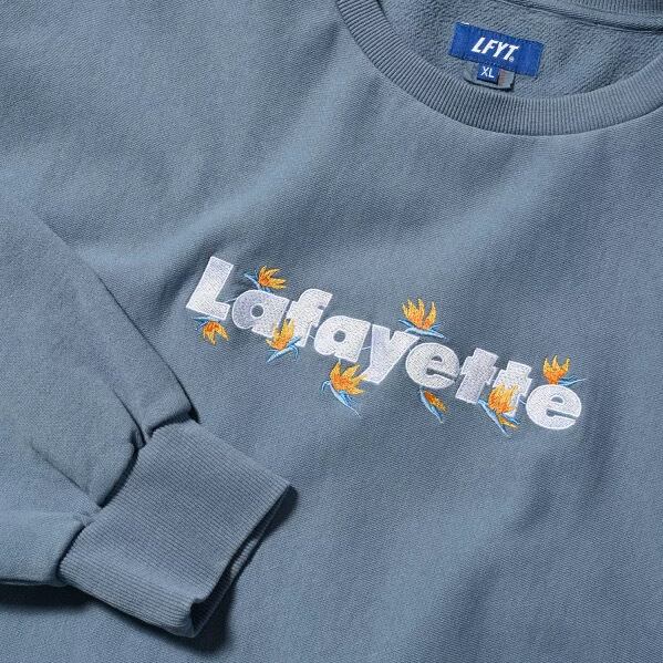 Lafayetteのコアロゴとストレリチアの刺繍をバランスよく配したUSコットンボディのクルーネックスウェット。新年の特別アイテムとして毎年大きな反響を生む話題のニューイヤースポットコレクション。極楽鳥花とも呼ばれる「ストレリチア」を高密度な刺繍で色鮮やかに配置。アメリカの綿花から生地を編み立て、特徴的なザラついた固い生地感と度詰めによってタフに仕上がったUSコットン製オリジナルスウェットボディを使用。タフな生地感や身頃のサイドリブなどのクラシックディテールと、ドロップショルダーで肩や袖周りにゆとりが生まれるルーズシルエット。ボディカラーはピグメントダイ加工による粗野感のある染色法で、生地の端や凹凸のある部分はややアタリが出ていて、ムラのある自然な色合いや風合いが魅力。・2023年新年一発目を飾るにふさわしいLafayetteロゴとフラワーを掛け合わせた限定デザインのロゴスウェット・ストレリチアとボディーカラーの絶妙なマッチング・人気のオリジナルUSコットンボディにピグメントダイ加工を施した拘りの仕上がり