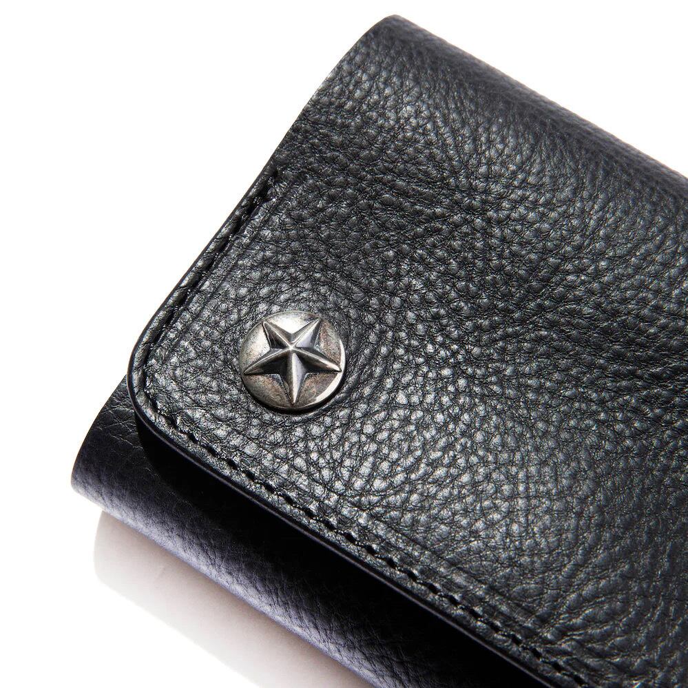 シルバーのスターコンチョボタンを使用し、作製された三つ折りタイプのハーフウォレット。レザーにはシボ感あるレザーを採用。使い込む程にシボが消え、艶感ある経年変化を楽しむ事が出来る。また、収納もしっかりと確保し、使い勝手の良いウォレットに仕上がっている。