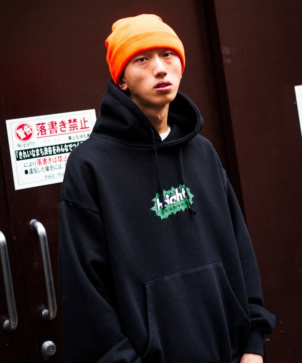 フロントは控えめなサイズのプリントながら、差し色のグリーンが効いたデザインは煙たいインパクトを感じさせる。