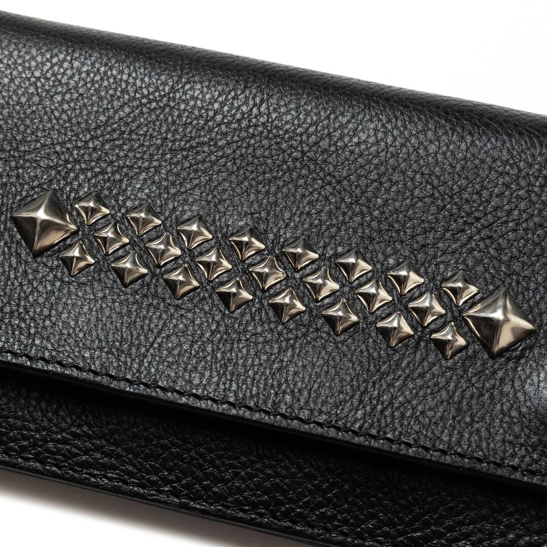 シボ感あるレザーにスタッズワークを施して作製されたロングウォレット。レザーは使い込む程にシボが消え、艶感ある経年変化を楽しむ事が出来る。また、収納もしっかりと確保し、使い勝手の良いウォレットに仕上がっている。