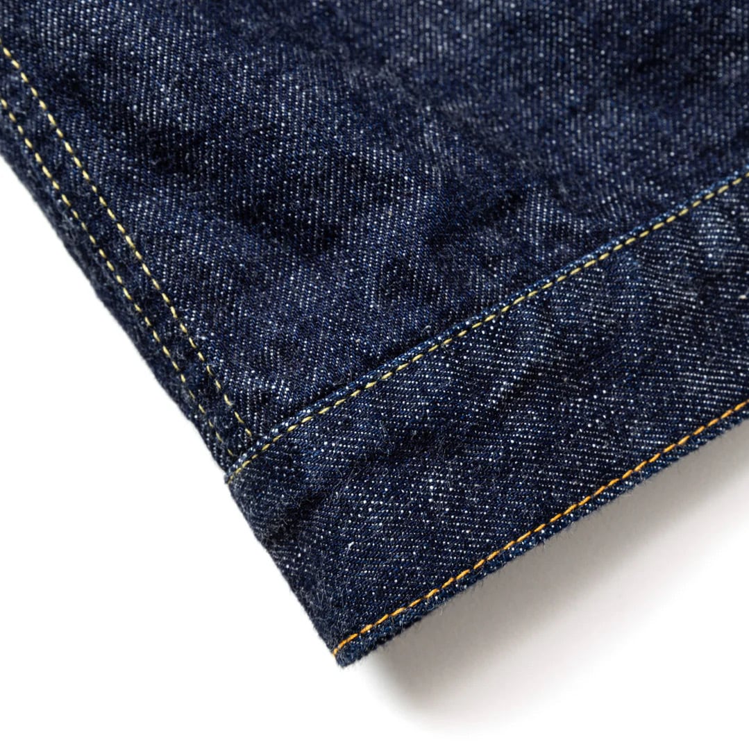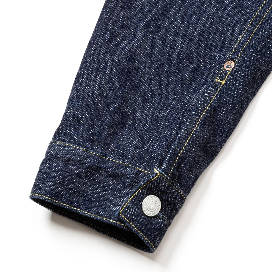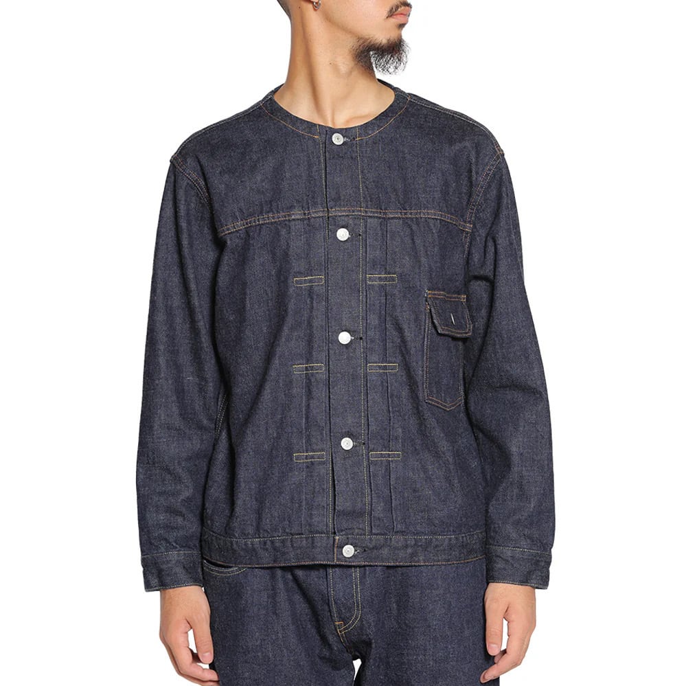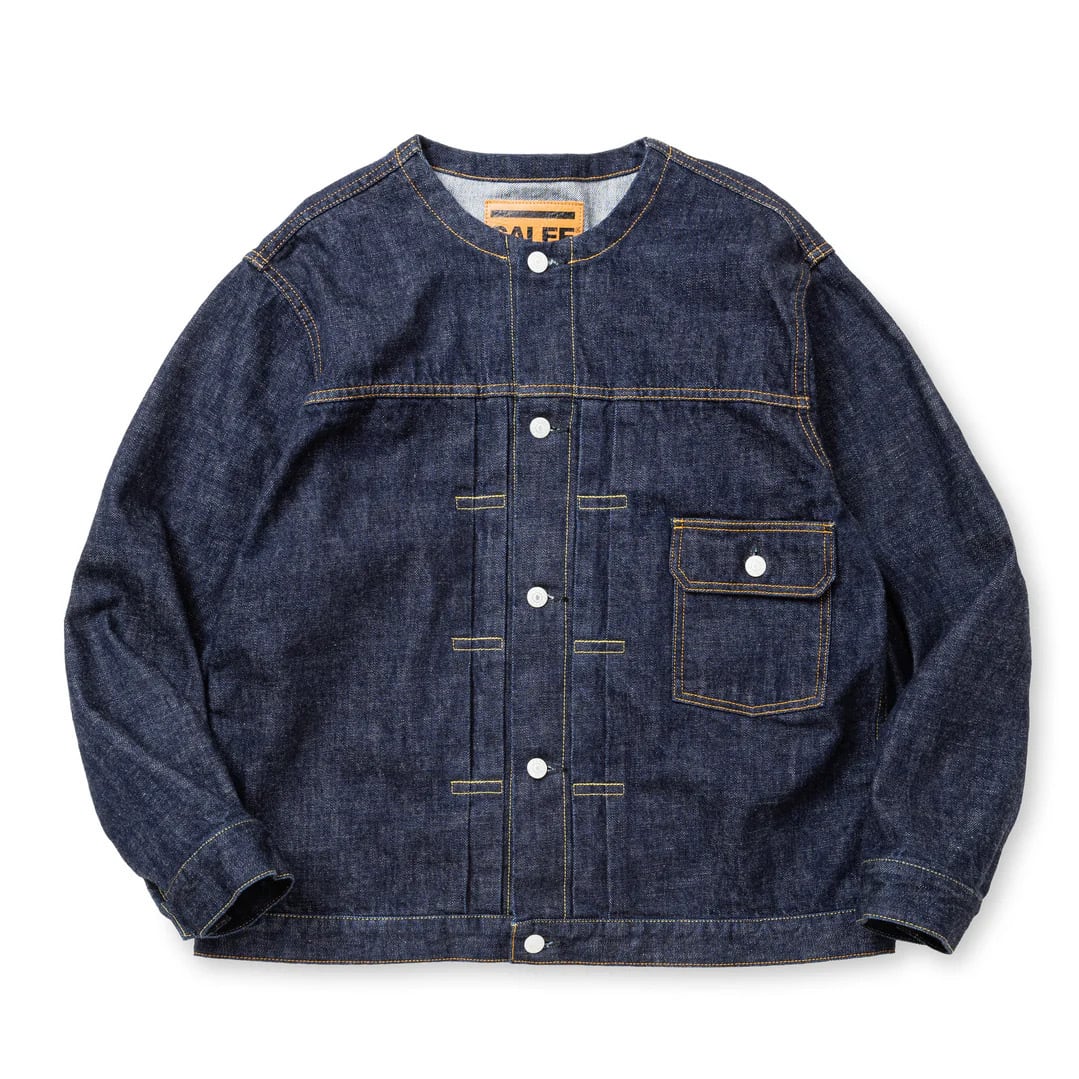 1stタイプノーカラーデニムジャケット。国内生産のメンフィス綿を使用した、INDIGO BLUEの14ozヴィンテージリプロデニム生地を採用。ワンウォッシュ仕上げ。
